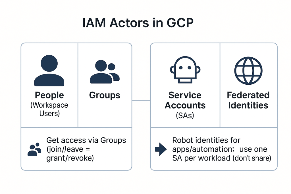 - Service Accounts (SAs) are robot identities for apps/automation; use one SA per workload (don’t share).